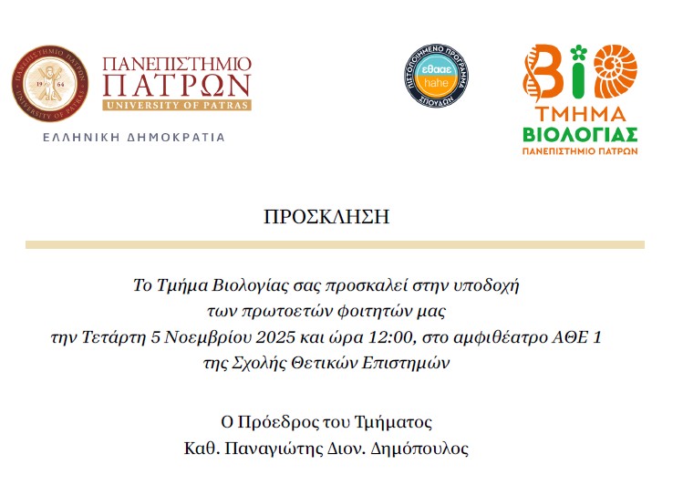 Το Τμήμα Βιολογίας σας προσκαλεί στην υποδοχή των πρωτοετών φοιτητών μας την Τετάρτη 5 Νοεμβρίου 2025 και ώρα 12:00, στο αμφιθέατρο ΑΘΕ 1 της Σχολής Θετικών Επιστημών